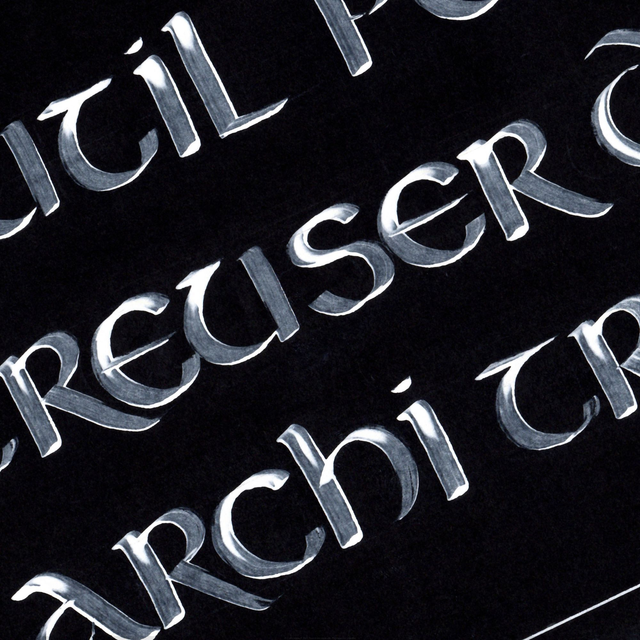 « Archipel : outil pour creuser des archi trous » Qui a dit que la calligraphie devait toujours être sérieuse ? Avec cette pièce unique, je me suis amusée à détourner les codes des définitions savantes pour en faire une œuvre à la fois élégante et décalée. Chaque lettre, tracée au calame et à l’encre blanche sur un fond noir profond, joue avec les contrastes et les mots, comme une invitation à voir la langue française sous un angle ludique.